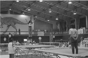次に後攻選手が予備跳躍を始め、先攻選手が行った1種目に1種目を付け加えて演技します。 |
